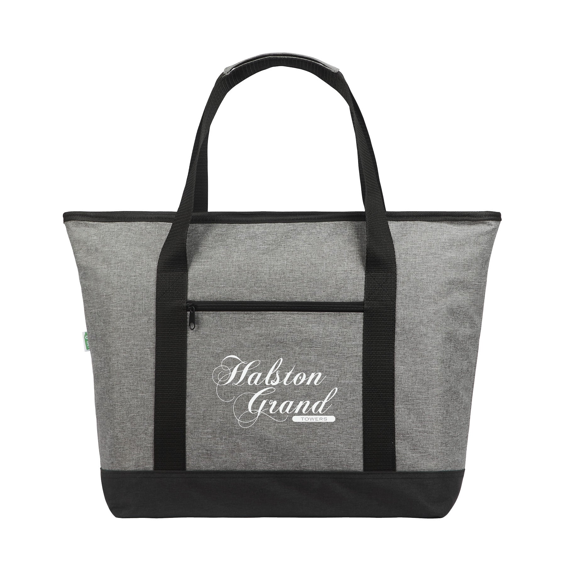 The Shoreline Cooler Bag is the ideal companion for a quick picnic to the park for the whole family. The outer fabric is sustainably made from recycled water bottles (RPET) and the spacious interior is lined with thick foam and heat-sealed PEVA lining. It also features an interior zippered mesh bag to hold keys or small items, a front zippered pocket, and reinforced carry handles. The Shoreline RPET 24-Can Cooler is an ideal gift option that combines functionality and affordability.