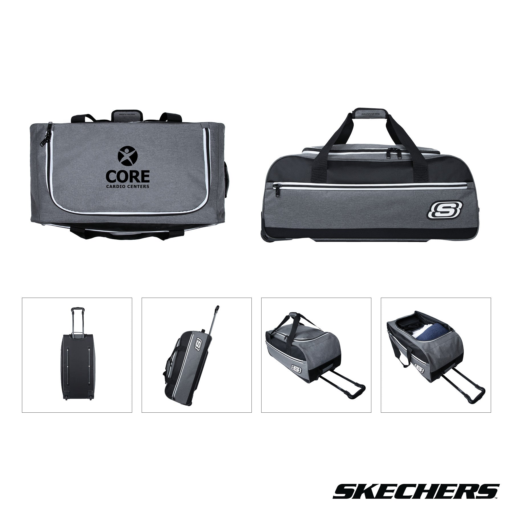 The Skechers 28" Saratoga Wheeled Duffel combines sporty styling with functional durability. Built for transport, the telescoping handle makes travel a breeze and the in-line skate wheels glide with ease. This spacious rolling duffel bag features a large, easy-access u-shaped dual-zippered opening, padded top carry handle, exterior zippered pocket, interior mesh zippered pocket and it folds down for easy storage. The Saratoga is a great travel companion for anyone as a weekend bag, overnight bag, short journey bag, camping bag, business duffel, sports duffel, or gym bag. Includes a 2-year limited warranty.