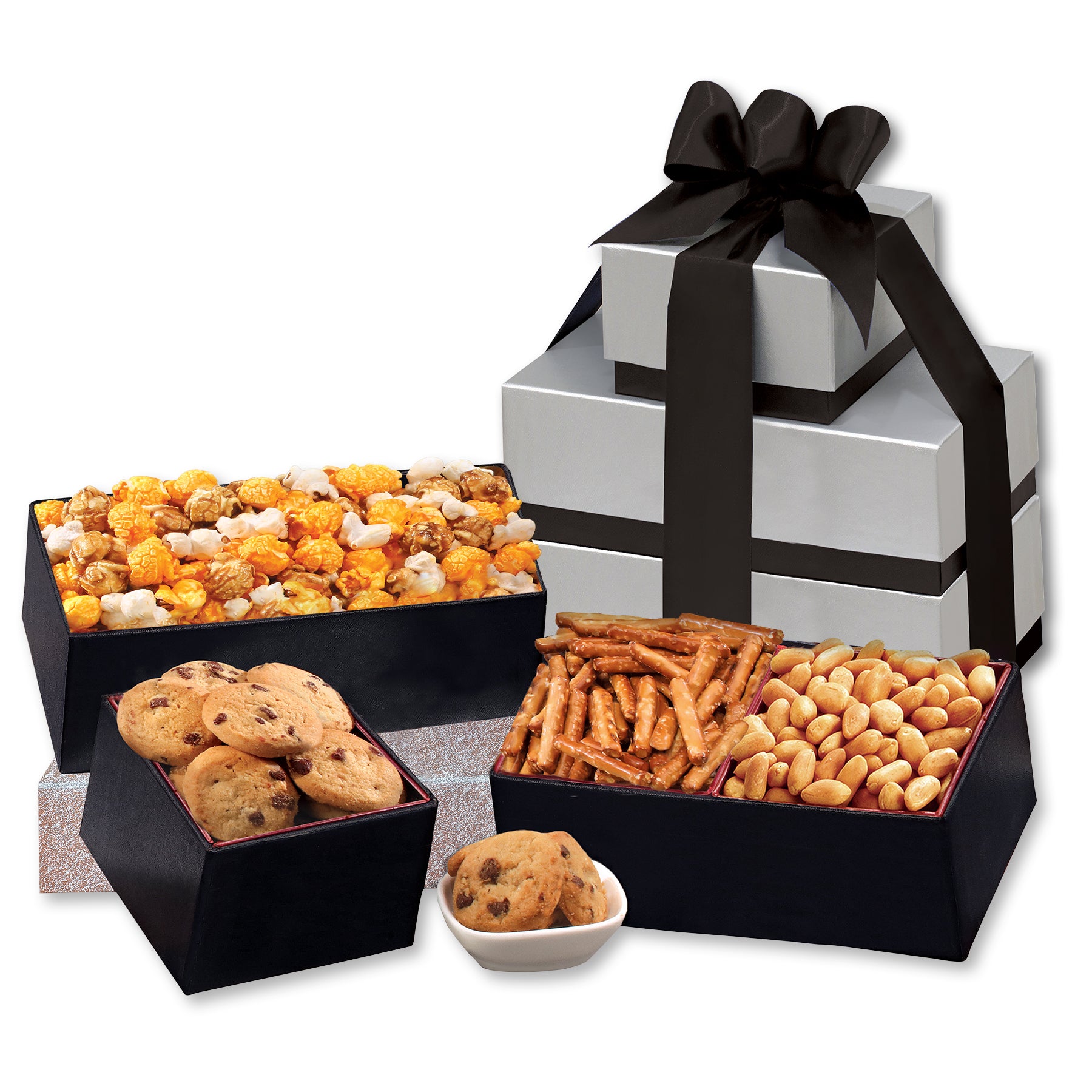 Snackers, rejoice! This delightful tower comes filled with satisfaction for even the most discerning of snackers, including sweet and salty treats to please every palate. Your logo is foil-stamped in silver on the black satin ribbon tying it all together. They're sure to recognize your appreciation with this fabulous gift! Contents: Chocolate Chip Cookies, 2.5 oz. Viginia Peanuts, 6 oz. Dipping Pretzels, 2 oz. Triple Mix Popcorn, 2.5 oz.