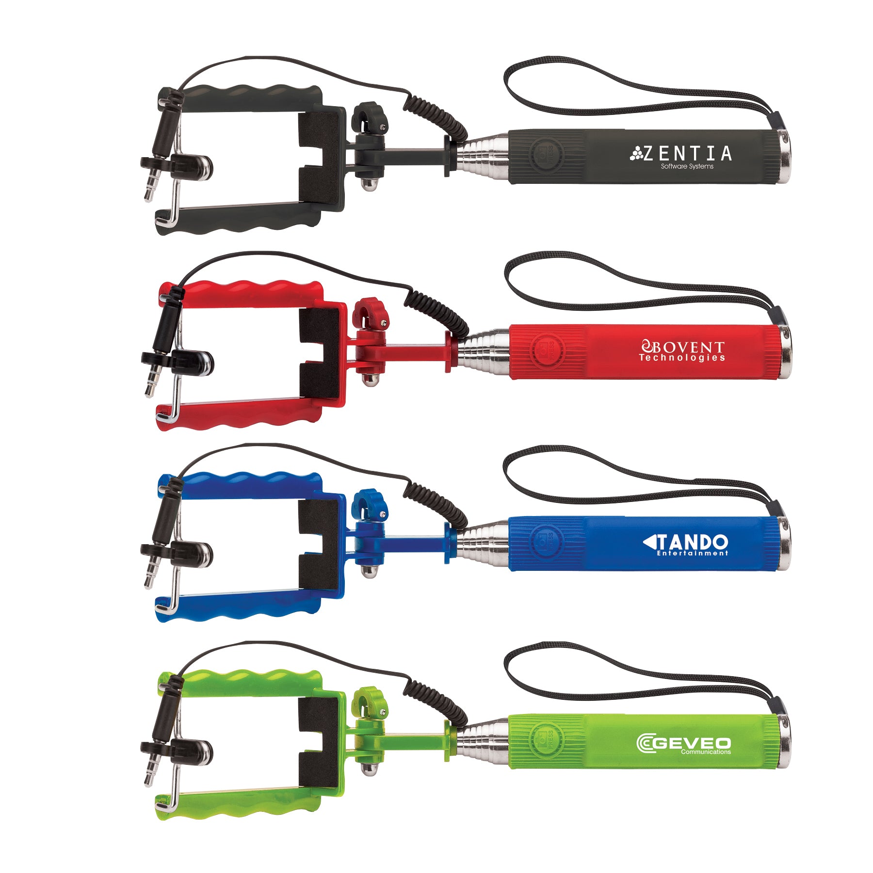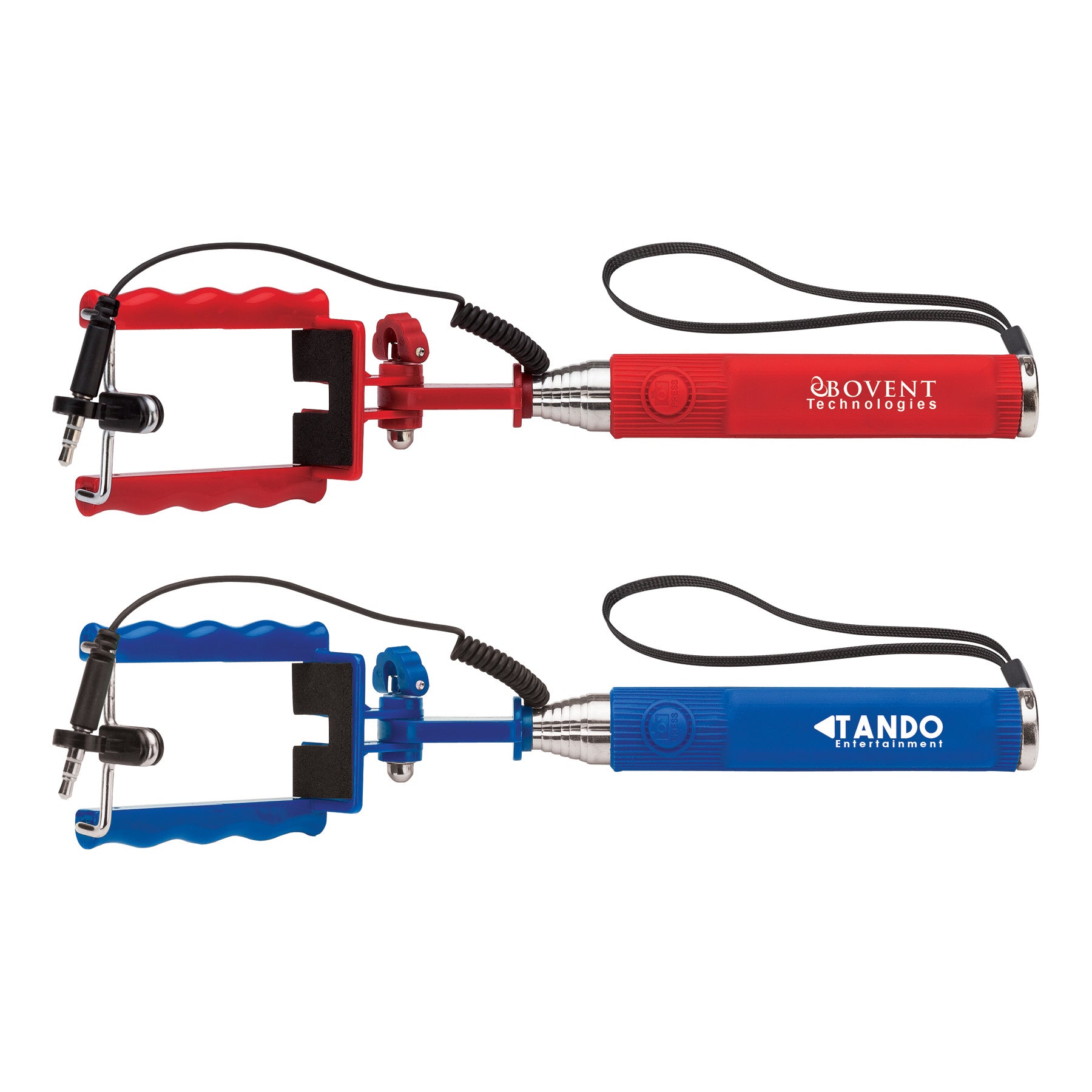 This compact selfie stick features a stainless steel handle and ribbed silicone grip. Hold your phone at a better distance for your next shot using the spring-loaded clamp. Insert the 3.5mm plug into your phone, turn on your camera and capture the moment with the handle-mounted shutter button. No batteries or Bluetooth necessary. The stick extends to 20 1/2" and can hold phones up to 3 1/2" wide. Accepts standard tripod mounting screw.