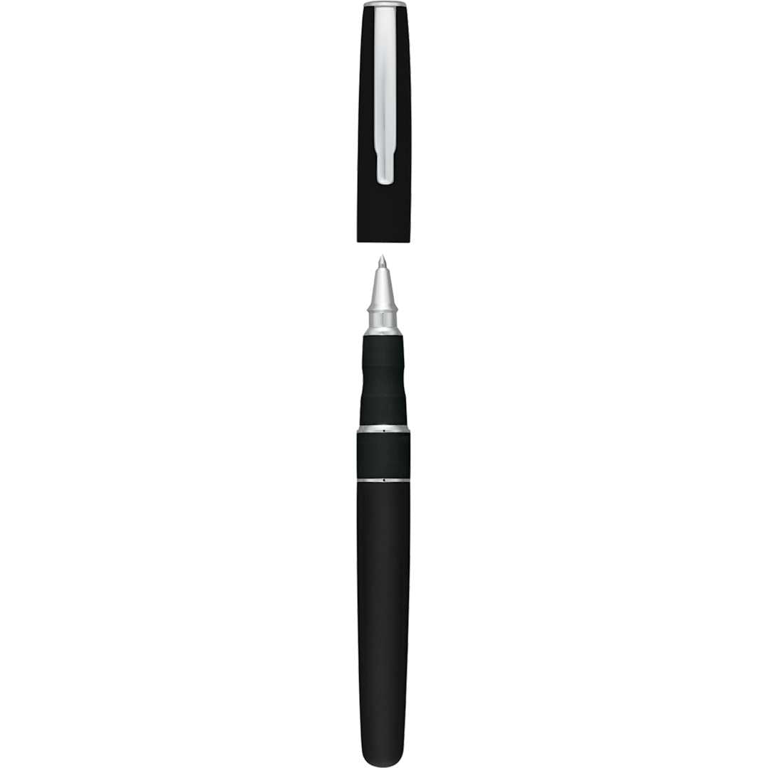 Spray rubber coat finish provides hours of comfort writing. Cap off design. Pen includes premium black roller ball ink cartridge. 0.7mm pen tip. Laser finish is shiny chrome.