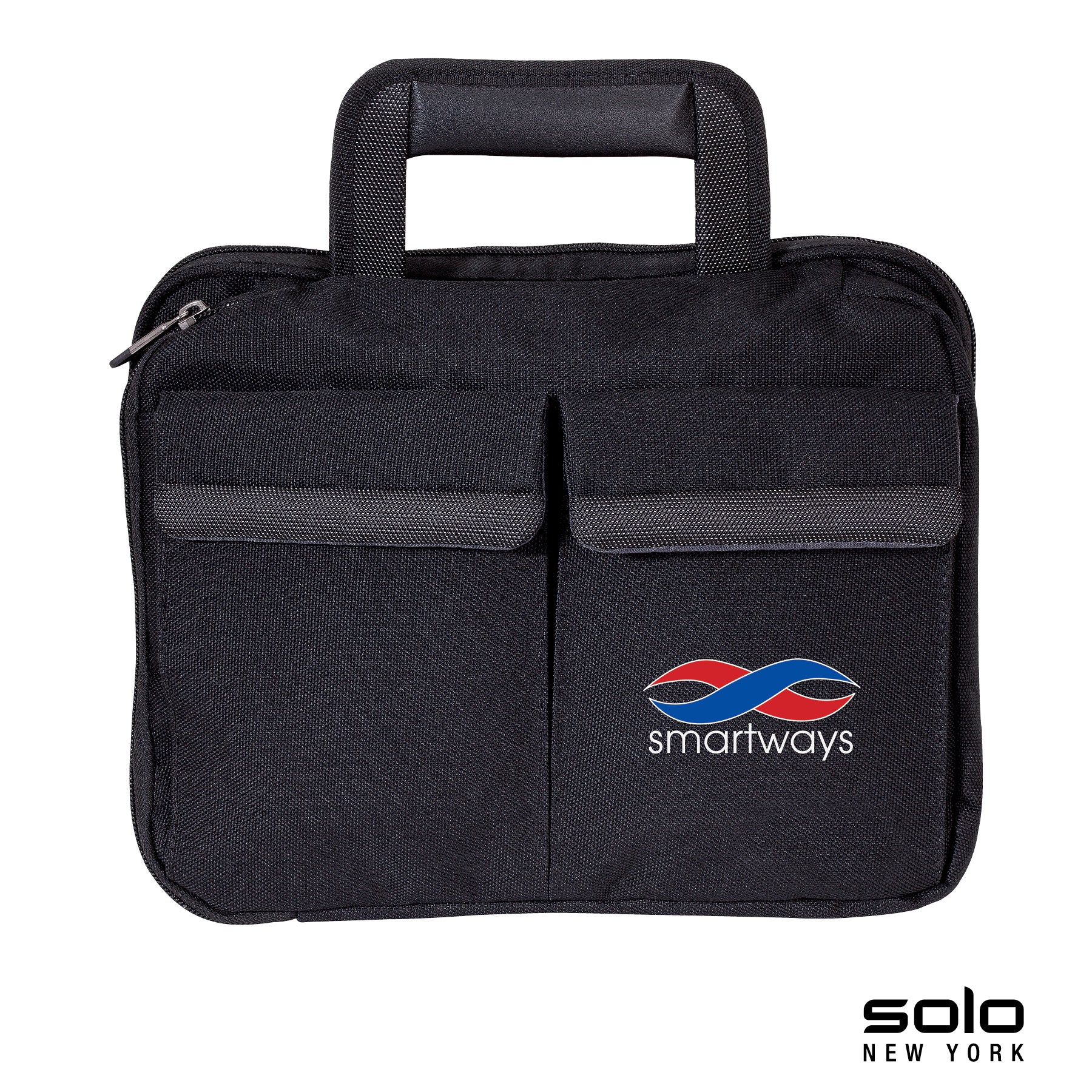 Solo New York netbook case features a padded main compartment that holds most netbooks and tablets up to 11.6" and a fully lined interior. Lay-flat design separates tablet or netbook from accessories and meets Travel-Sentry® checkpoint-friendly requirements to allow clear CheckFast x-ray scanning. Front zippered compartment allows storage of travel documents or other items. Two exterior accessory pockets with hook and loop closure provide storage for power cord, cell phone, and extras. Use retractable handle to carry the netbook case.