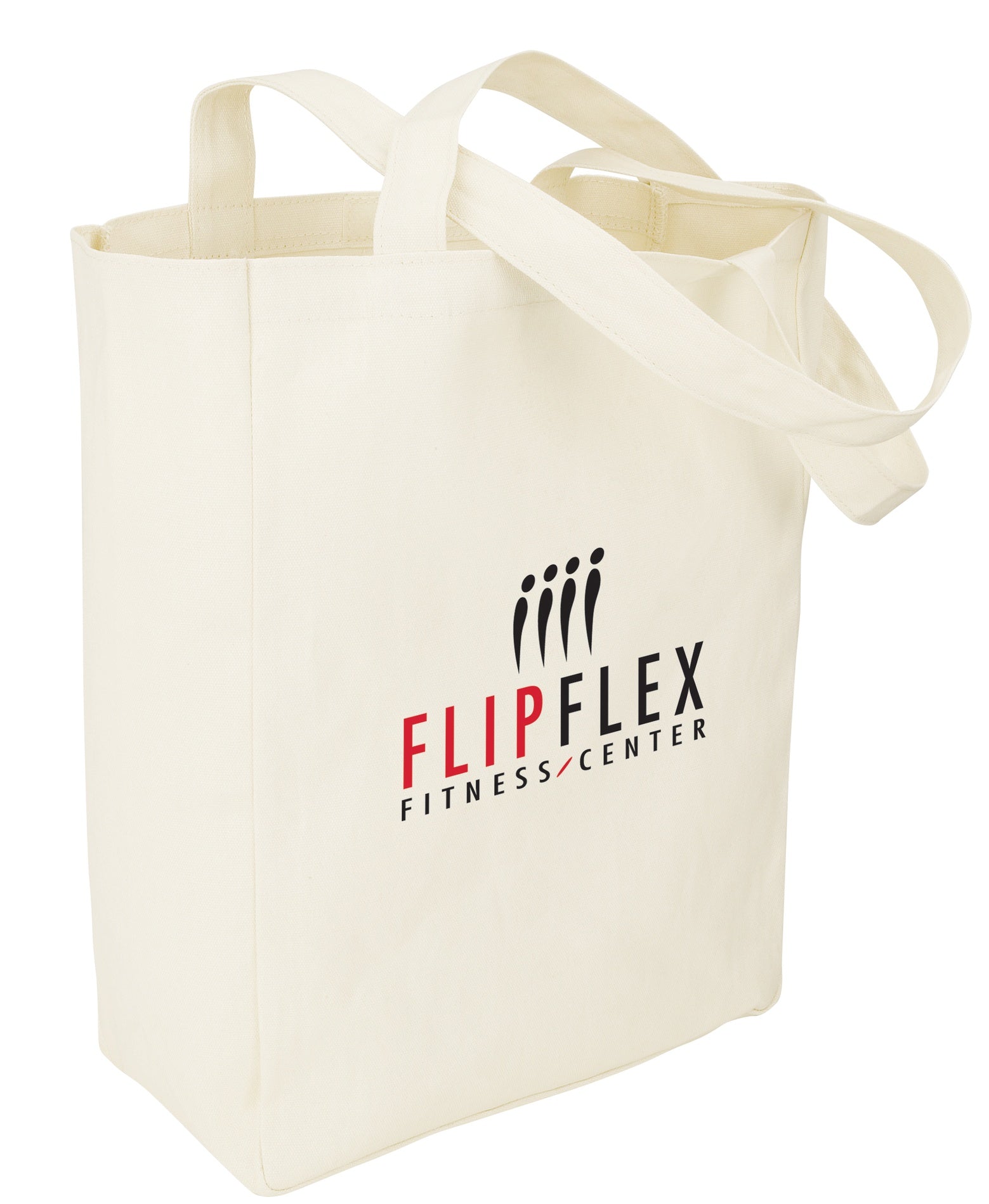 Natural cotton canvas tote features a 4 3/4" gusset, hook and loop closure and 25" handles.