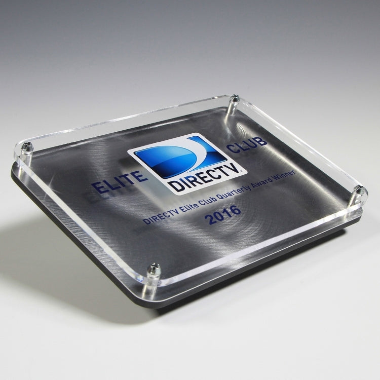 These innovative new awards include an acrylic layer with silver screws on top of a swirled metal base and are elevated on a slanted oval acrylic base. The floating acrylic can be screened or 4 color process printed or laser engraved.?