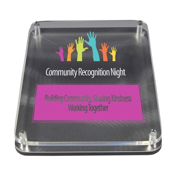 These innovative new awards include an acrylic layer with silver screws on top of a swirled metal base and are elevated on a slanted oval acrylic base. The floating acrylic can be screened or 4 color process printed or laser engraved.