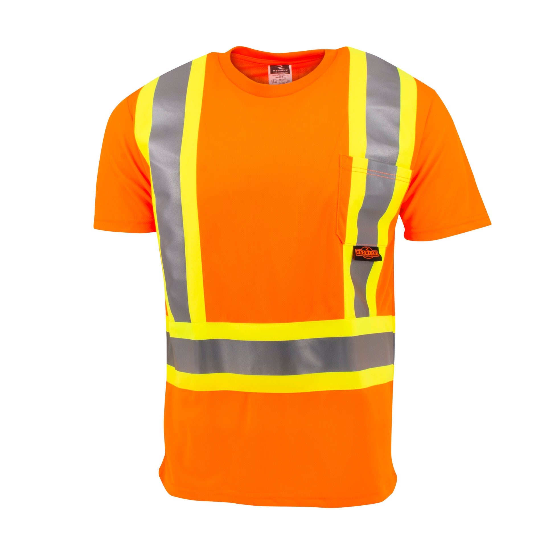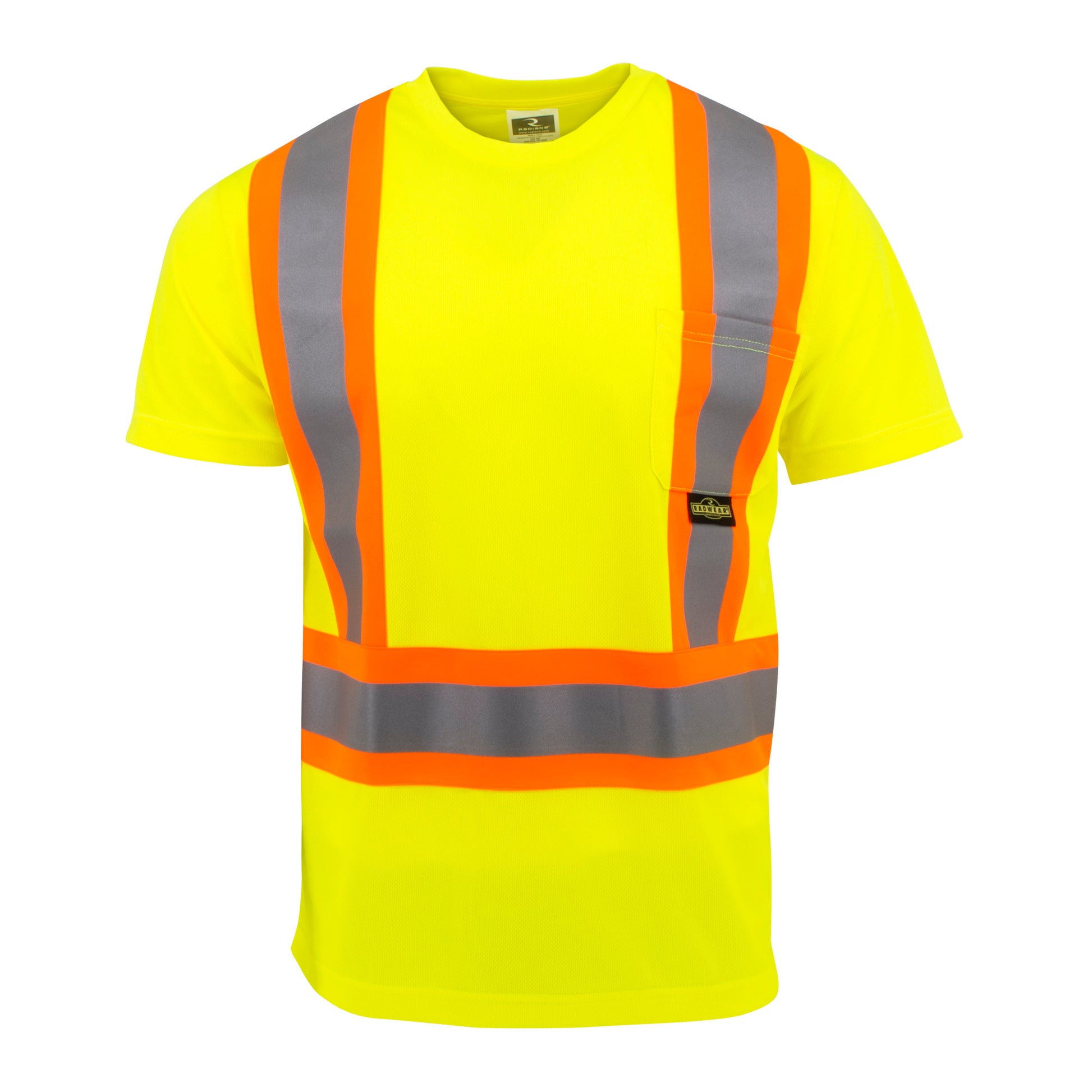 The Radians ST11X-2 short sleeve T-shirt has a reflective X-Back design. The reflective stripes on the front and the “X” stripes on the back ensure that some sections of the striping will be visible from all angles around the body providing 360° visibility, which alerts vehicle operators of the direction the worker is facing. The stripes are adhered by heat transfer rather than sewn on, enhancing comfort and mobility. This T-shirt is made from a Birdseye Mesh material that provides maximum breathability without compromising durability. Its wicking properties improve comfort by making the wearer feel cooler in hot weather. The single-chest front pocket also has reflective tape. Rated ANSI/ISEA 107 Type R Class 2 and CSA Z96.