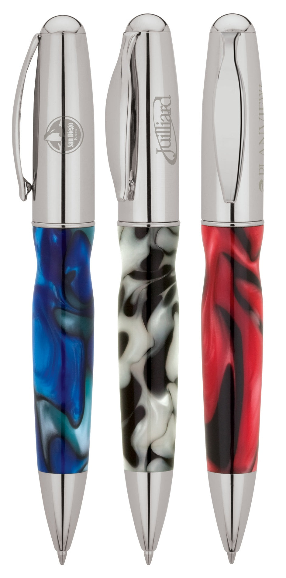 Twist-action mechanism, swirled resin barrel, chrome finish brass cap. See details