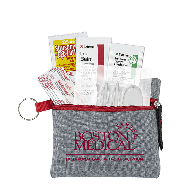 This Zippered pack contains: 4 Standard Size Latex Free Bandages 2 Antiseptic Towelette 1 Antibacterial Hand Sanitizer 1 Sunscreen SPF30 Lotion 1 Lip Balm 1 Golf Kit - 1 Divot Tool, 5 Golf Tees & 1 Ball Marker