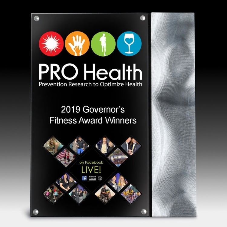 These plaques feature machined and swirled metal stars and solid strips mounted on black polished beveled acrylic. The clear acrylic imprint panel is decorated by Screen Printing, Laser Engraving or 4 Color Process Imprint Printed and is elevated and held in place with decorative chrome hardware.