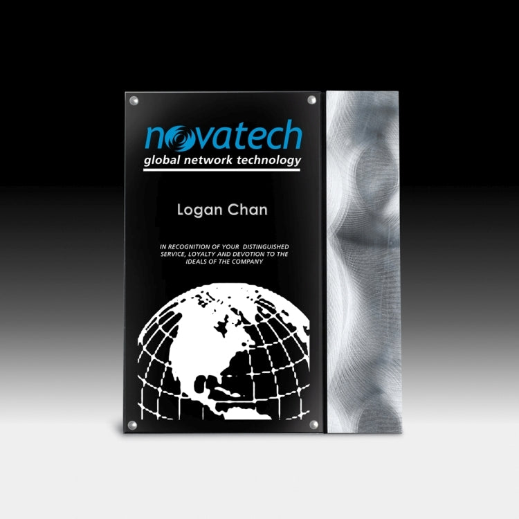 These plaques feature machined and swirled metal stars and solid strips mounted on black polished beveled acrylic. The clear acrylic imprint panel is decorated by Screen Printing, Laser Engraving or 4 Color Process Imprint Printed and is elevated and held in place with decorative chrome hardware.