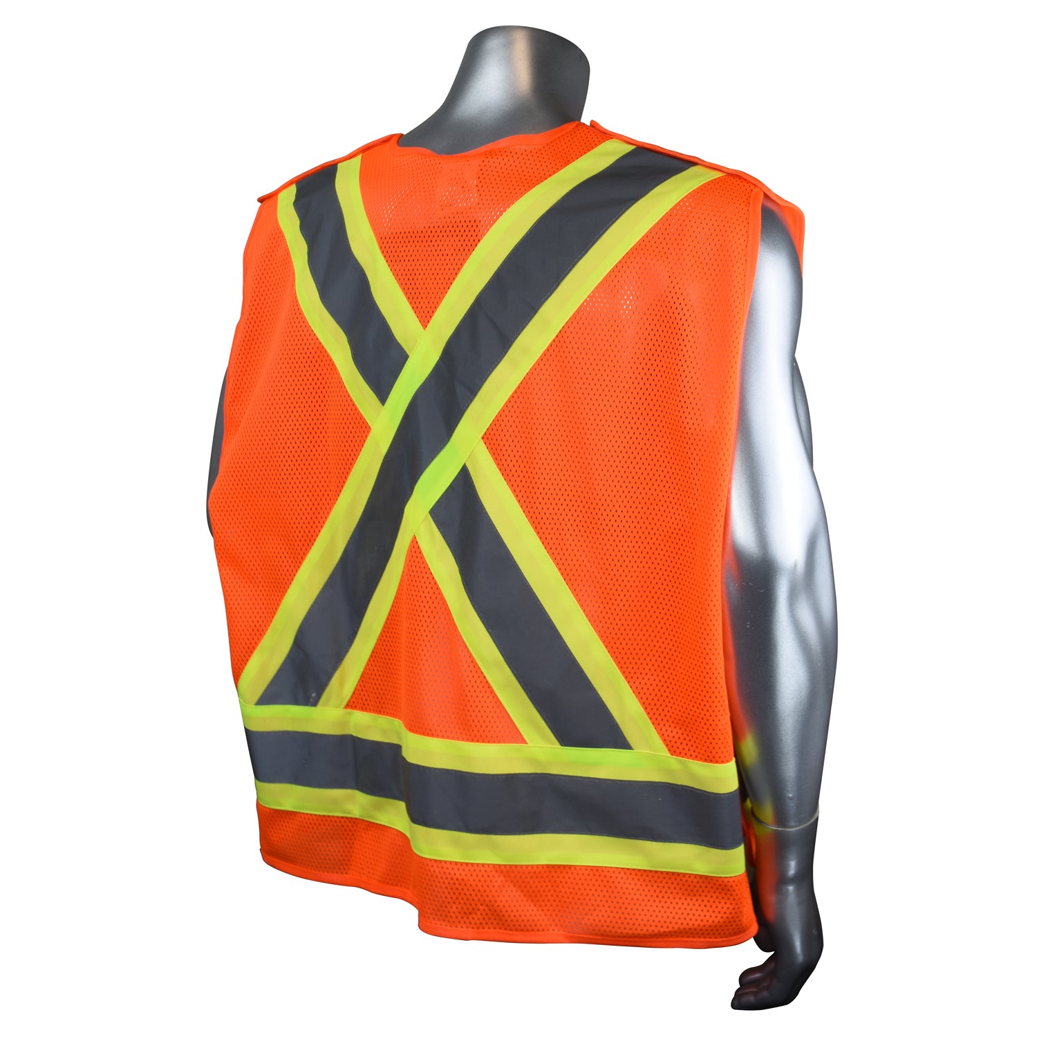 The Radians SV020X-2 Heavy Duty 7-Pocket Tear Away Cruiser Vest is made of high visibility 100% polyester and 2" silver reflective tape in an X-Back design. It has plenty of storage with 7 pockets including badge holder, radio pocket, and 3 interior pockets. This vest has a solid front with mesh back, and breakaway at shoulders and waist.