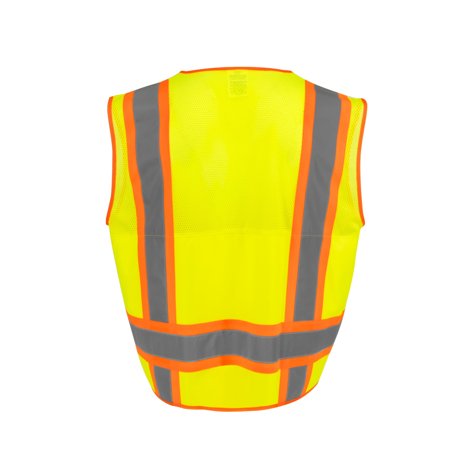 The Radians SV69-2 Type R Class 2 hi-vis safety vest features mesh and solid fabrics with contrast trim and binding so workers stand out in low-light conditions. This surveyor-type vest is equipped with multiple pockets, strategically placed for easy access to tools and accessories, including an over-sized radio pocket for holding a mobile phone. The back plan pocket adds another level of utility to a best-selling style, making this vest an ideal safety choice for visibility, performance, and functionality.