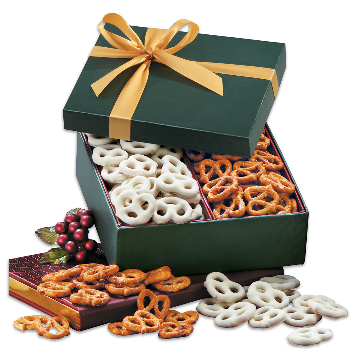 This rich, forest green gift box foil-stamped with your logo is filled with sweet and savory treats! A half-pound of frosted pretzels are packed alongside a quarter-pound of zesty seasoned pretzels. This combination has earned high praise around our home. Contents: Frosted Pretzels, 1/2 lb. Seasoned Pretzels, 1/4 lb.