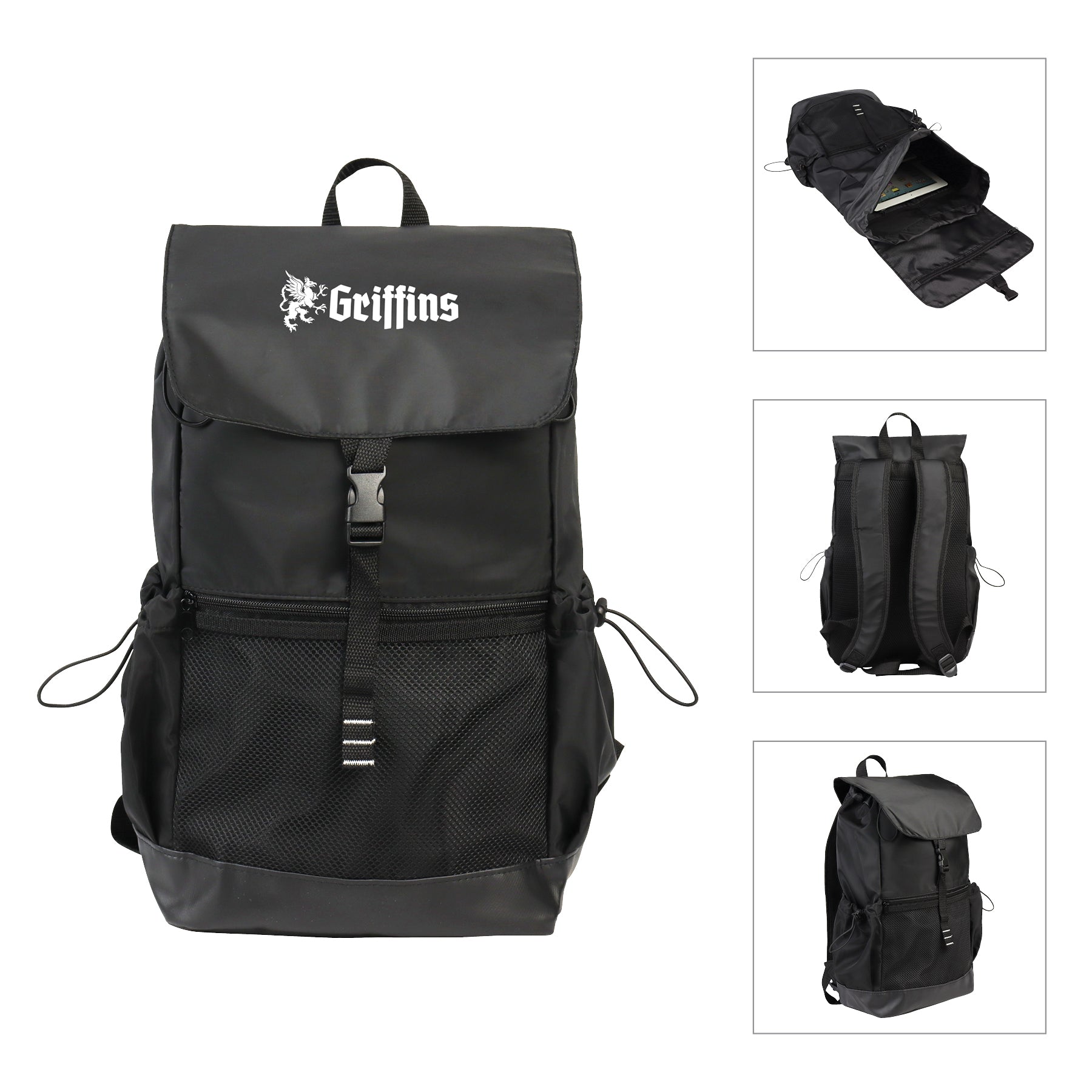 The Tacoma Backpack is crafted with 210D Compound Memory Polyester Fabric, providing a soft touch feel as well durability and extra protection for your gear. Designed for comfort and convenience, it features a padded mesh backside, adjustable padded shoulder straps with air mesh cooling, and a carry handle, ensuring ease of transportation on all your adventures. Its top flap has an underside zippered pocket for small accessories and a buckle strap for a secure closure. The spacious main compartment has a locking drawstring closure and an interior slip pocket that holds most laptops up to 17". The front zippered mesh pocket allows quick access to essential items, while the two side pockets with drawstring closures offer additional storage options for bottles and more. The Tacoma will keep your belongings organized during daily commutes or adventurous travels.