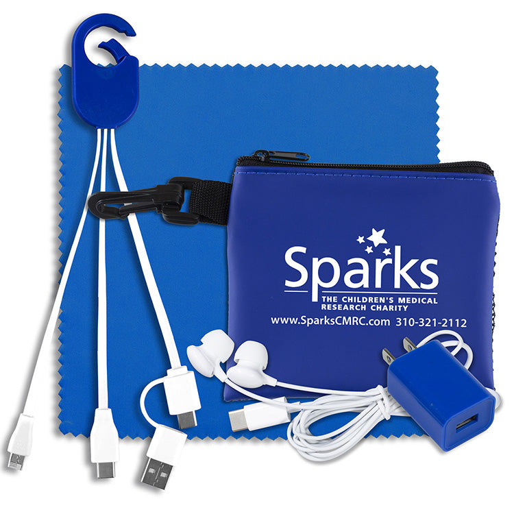 Tech Kit comes with the following matching unimprinted items: #5088 6"x6" Microfiber Cleaning Cloth, #5140 5-in-1 Charging Cable with 5 pin attachment for use with Apple ® devices, Micro USB attachment & Type-C connector, both to use with current Android® & Apple ® devices. Apple iPhone® and Apple ® are a registered trademarks of the Apple ® corporation.