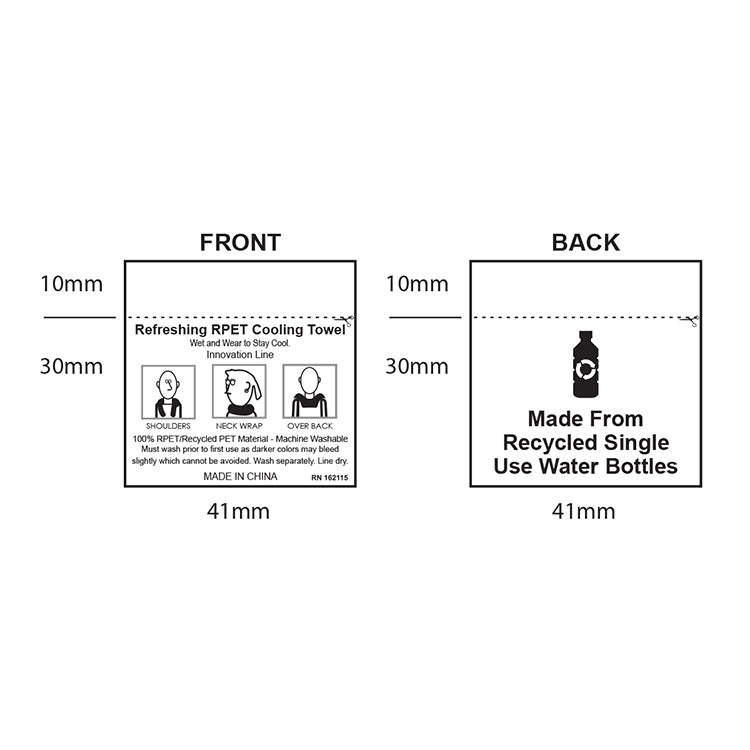 The rPET Cooling Towel is made with recycled polyethylene tetraphyte (rPET) plastic from sources such as single use soda and water bottles. Just add water and wring to feel cooler when working out indoors or participating in outdoor wear. Repeat order ink colors will vary from order to order. PMS matches can only be close and cannot be matched exactly for digital printing. Claims resulting from printing imperfections only noticeable when magnified or enlarged will not be accepted. Logos/printing must be viewed at arms length by the human eye.