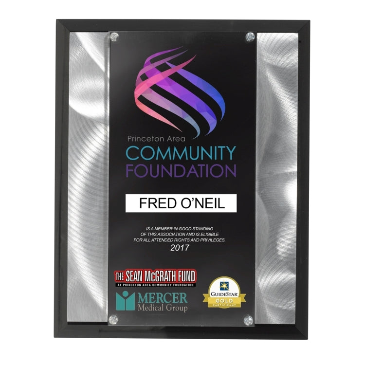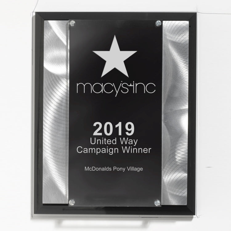 These plaques feature machined metal strips inset on finely polished black beveled acrylic. The clear acrylic imprint panel is decorated by Screen Printing, Laser Engraving or 4 Color Process Printed and is elevated and held in place with decorative chrome hardware