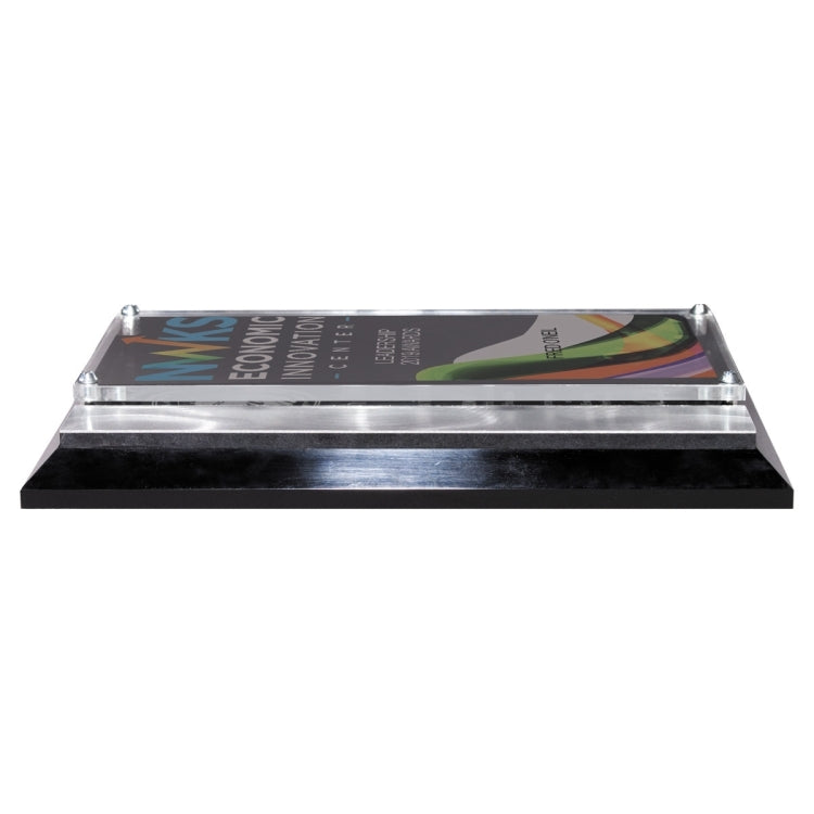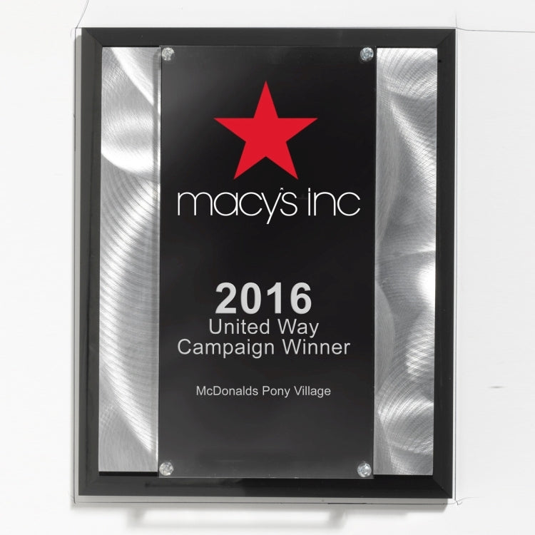 These plaques feature machined metal strips inset on finely polished black beveled acrylic. The clear acrylic imprint panel is decorated by Screen Printing, Laser Engraving or 4 Color Process Printed and is elevated and held in place with decorative chrome hardware.