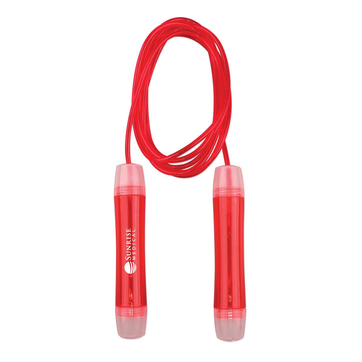 Jump ahead of your competition with our translucent jump ropes! Ideal for tradeshows, conventions, gyms or school fundraisers. Add your custom imprint or no imprint at all, depending on your project needs. Available in red (S21211X) and blue (S21210X). Handle: 5"; Rope:8'