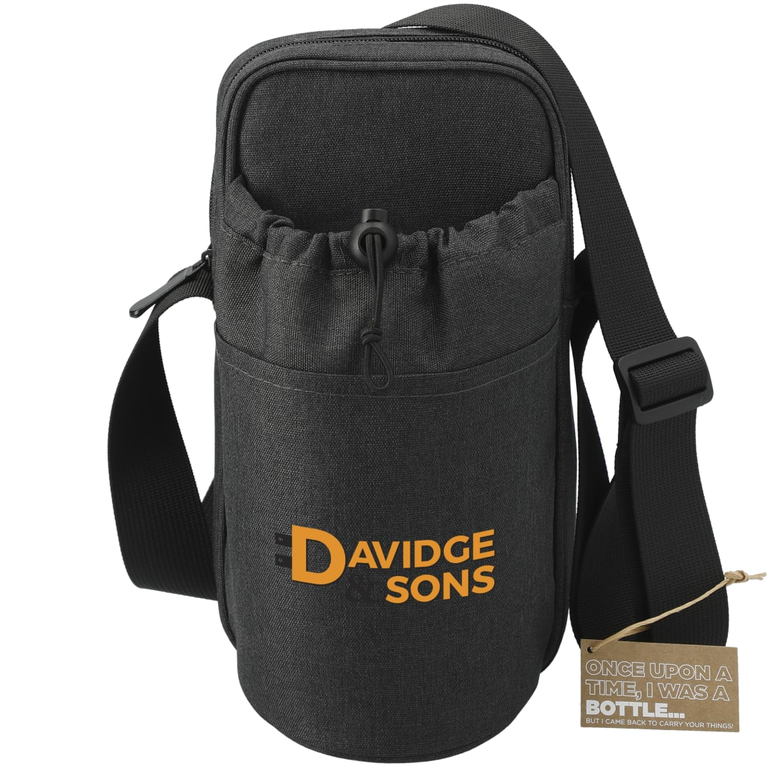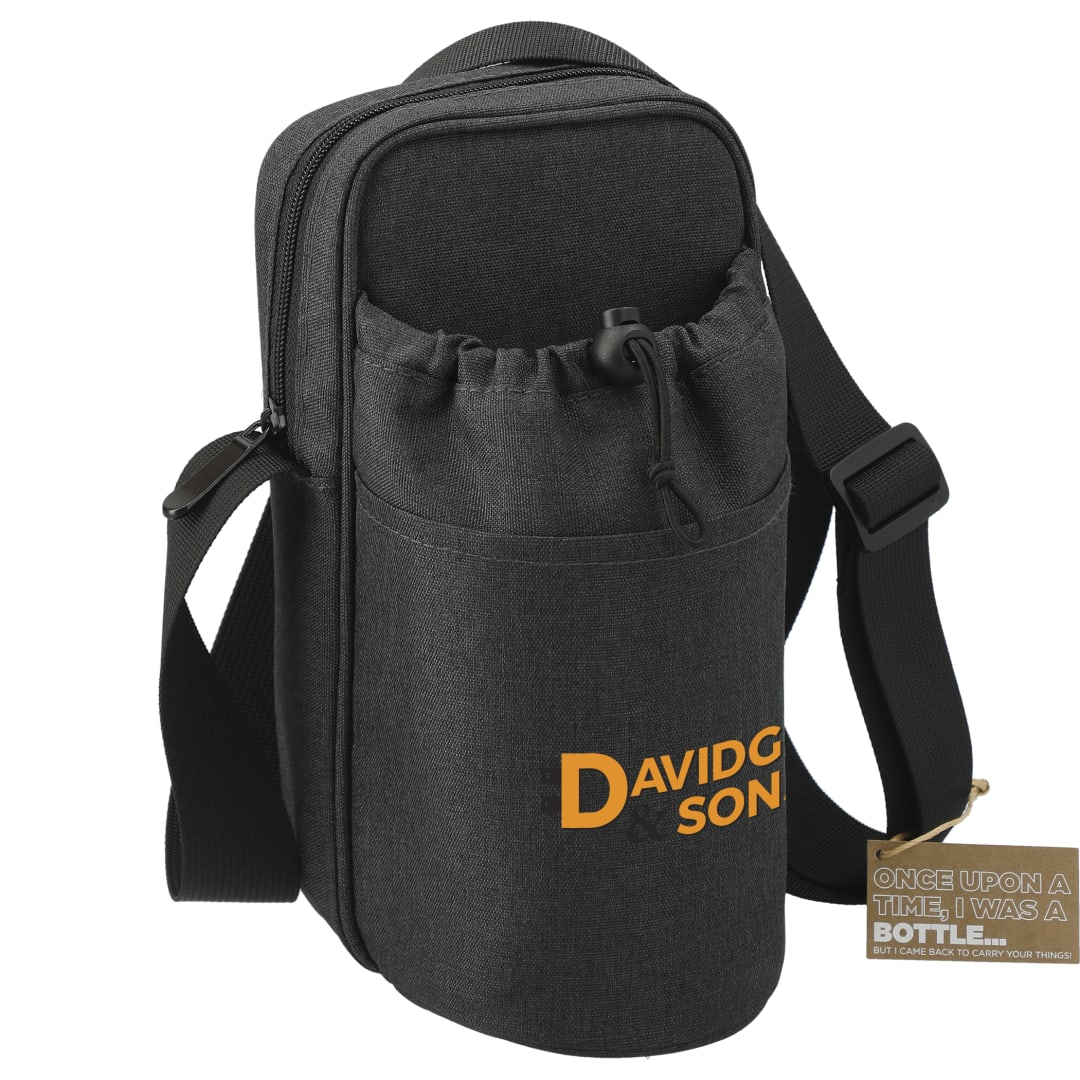 The Traver RPET Adjustable Bottle Sling Cooler w/ Pouch provides convenient, hands-free carrying for drinkware bottles. The insulated cooler liner helps keep your beverages cold while preventing condensation on sport bottles. An integrated toggle holds drinkware in place while inside the pouch. The zippered pocket features a built-in card organizer as well as elastic bands to store your accessories. Features an adjustable strap for on-the-go comfort. This product’s main material is RPET 600d and its black lining and webbing are RPET 210d, which is made from recycled plastics, such as water bottles. Note: PEVA lining of pouch is not made with recycled materials. Includes interior ID label. Disclaimer: There may be minor variations in color of the actual product due to the nature of the fabric dyes, weaves and printing. Bottle sold separately. The maximum diameter of the bottle that can be inserted into the bottle holder is 3.5”.