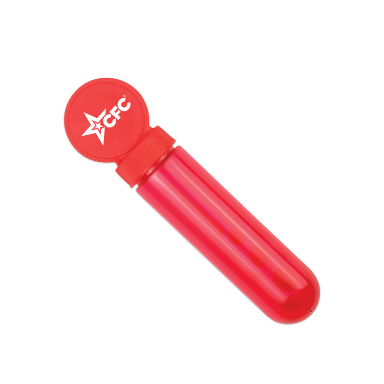 Bubbles make for a great time! Our 5" tube bubbles with topper makes an ideal promotional product for trade shows and events. Add your logo and be associated with a good time. Available in: Red, Blue, Yellow, Green and White