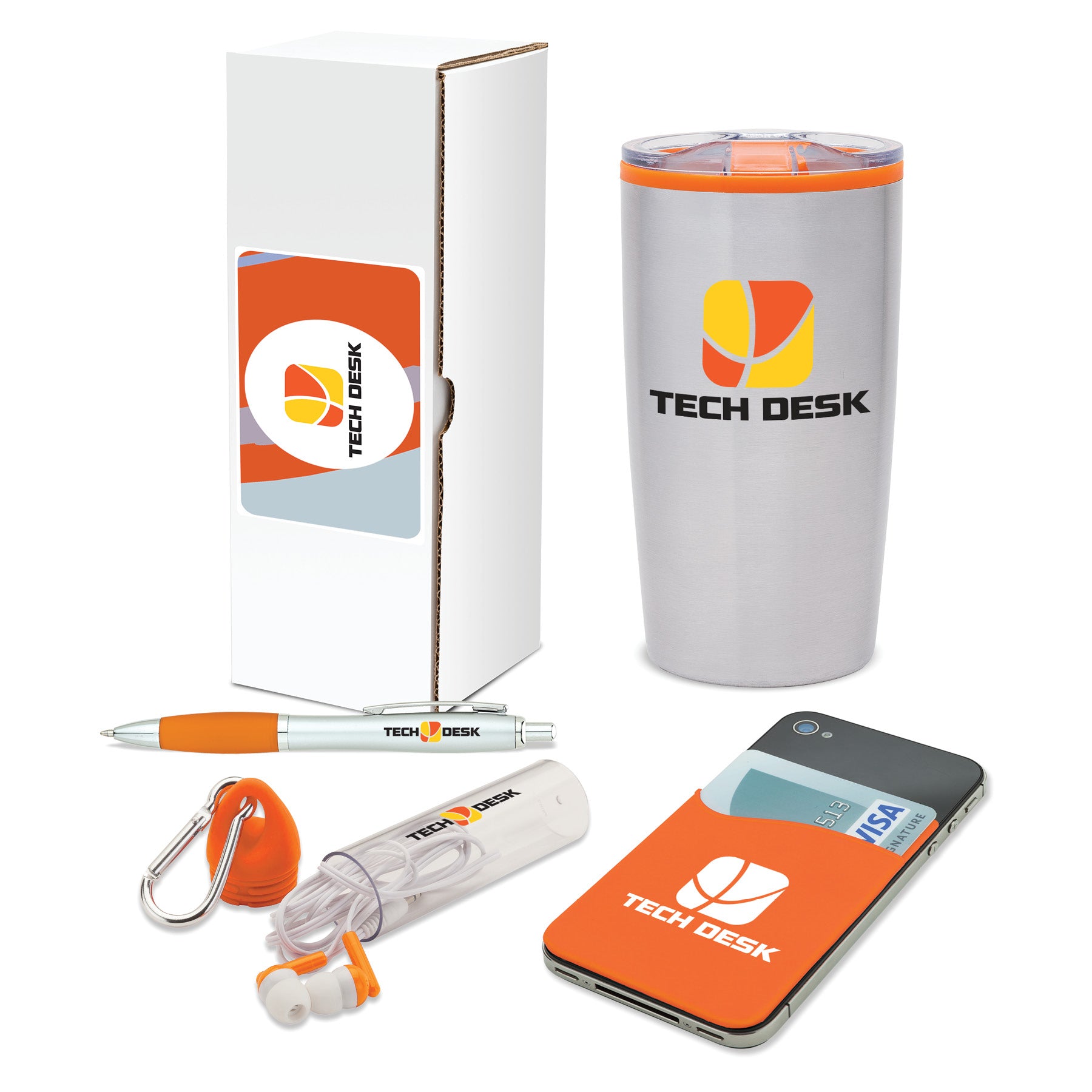 The Valued 4-Piece Thank You Gift Set is a thoughtful gift for employees, customers and colleagues. It comes packaged together in a customized gift box and has a 20 oz. double wall, stainless steel tumbler with polypropylene liner a clear slider lid and and silicone stereo earbuds that come in a clear case with a carabiner clip. These items are useful and convenient to use at work and when working out at the gym. This set also includes a silicone phone wallet with an adhesive back that holds several credit cards, access cards or ID cards and a plunge-action ballpoint pen with a matte silver barrel and translucent colored rubberized grip. Send the Valued 4-Piece Thank You Gift Set to your employees and let them know that they're VALUED.