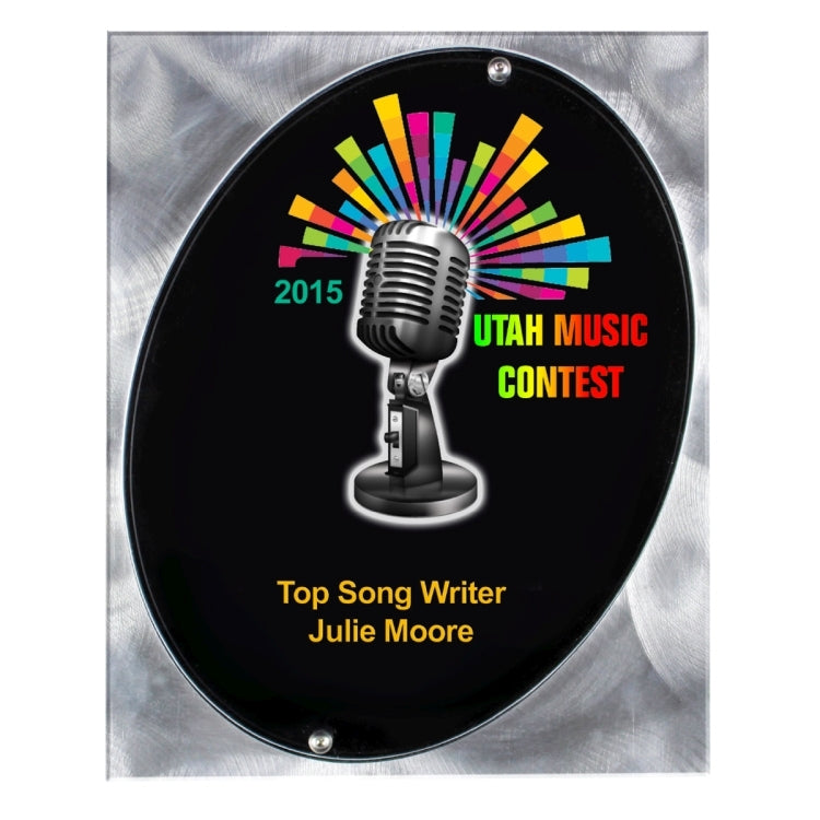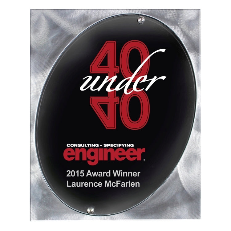 These modern geometric shapes are sure to grab the attention of any recipient. The clear acrylic imprint panel is suspended with decorative chrome hardware over a black acrylic material which is surrounded by a frame of swirled metal. They can be Screen Printed, Laser Engraved or 4 Color Process Printed.