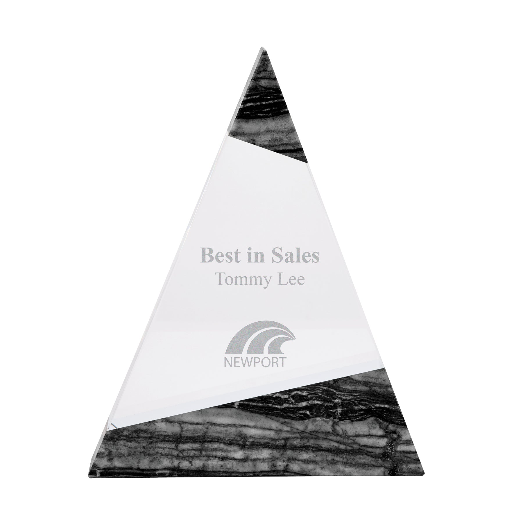Celebrate excellence with the Vega Triangle Crystal Award. This masterpiece features a striking triangular crystal body that embodies beauty and elegance. The crystal’s clear, polished surface reflects light beautifully, making it the perfect centerpiece for recognition. Adding to its grandeur, the top and base are accented with luxurious marble trim, offering a classic and sophisticated touch. The contrast of the sleek crystal with the rich marble creates a timeless design that will stand out in any display. Ideal for honoring top performers, this award is not only a symbol of success but also a work of art.