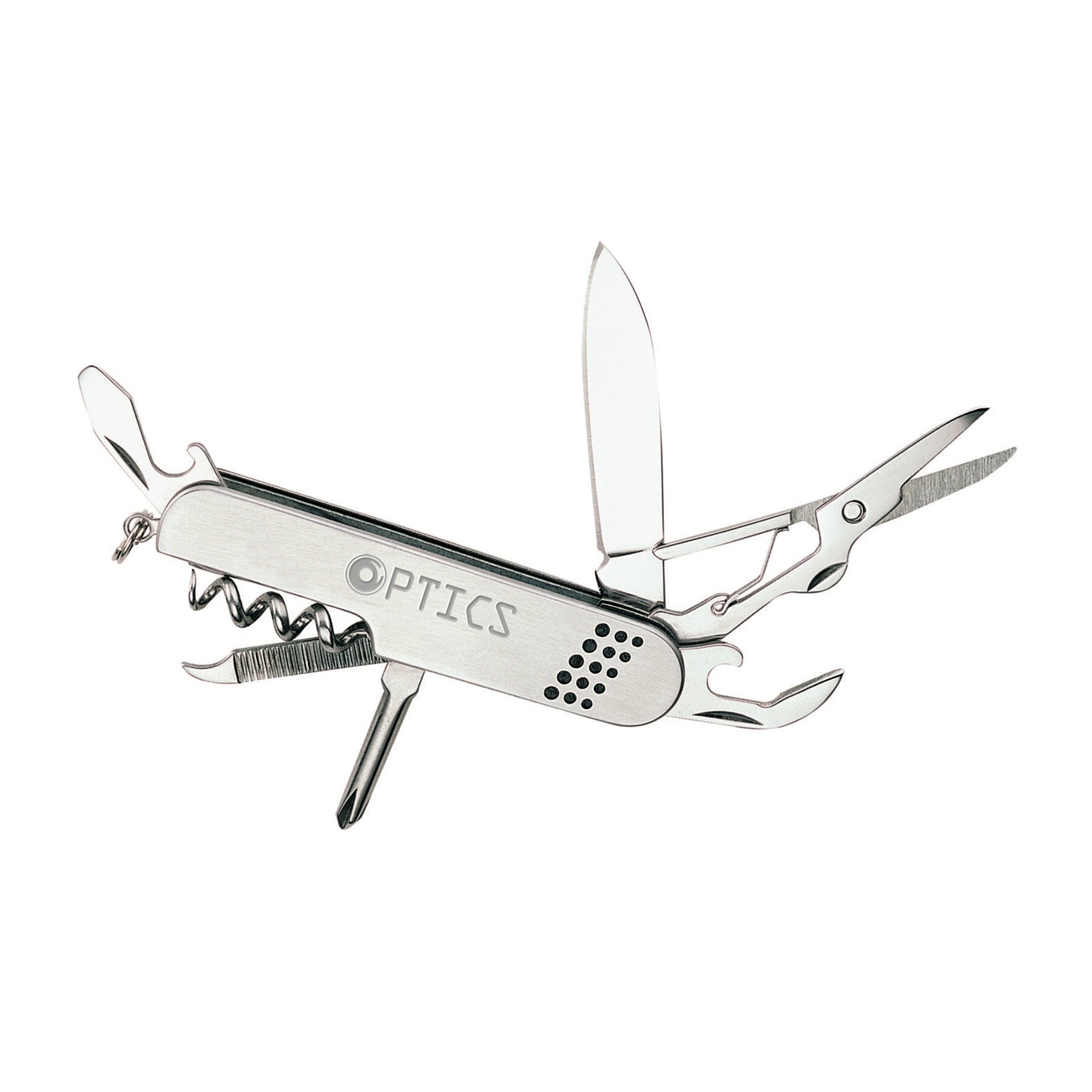 Knife, scissors, bottle opener, can opener, Phillips screwdriver, flathead screwdriver, nail file, corkscrew, punch, split ring, steel construction.
