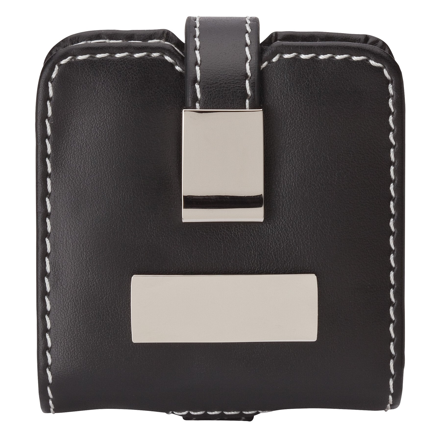 Stylish drop-down travel alarm clock features white contrast stitching, snap closure and laser engraved metal plate i... See details