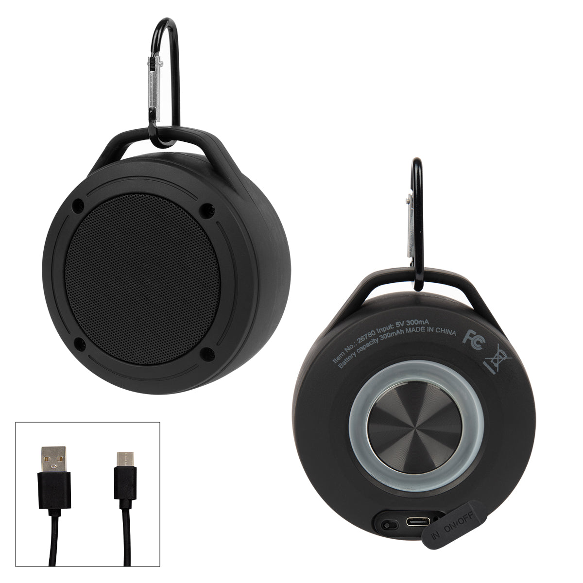 Now With A Type-C Input (Cord Included). Wireless Speaker Featuring High Definition Bluetooth® 5.0 Technology. Simply Pair With Your Device To Enjoy Dynamic Stereo Sound. Carabiner Attachment. 300 mAh Lithium Polymer Battery. Pairs From Up To 30 Feet Away. Up To 1 ½ Hours Of Play Time. Perfect For Your Home, Office Or Outdoor Activities. The Bluetooth® word mark and logos are registered trademarks owned by the Bluetooth SIG, Inc. and any use of such marks by Hit Promotional Products, Inc. is under license. Other trademarks and trade names are those of their respective owners.