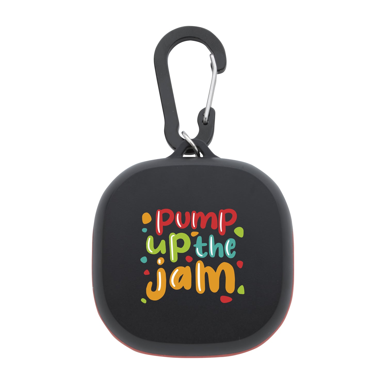 The Water-Resistant Speaker with Carabiner is IPX4 rated and has a 3W output for playing music.