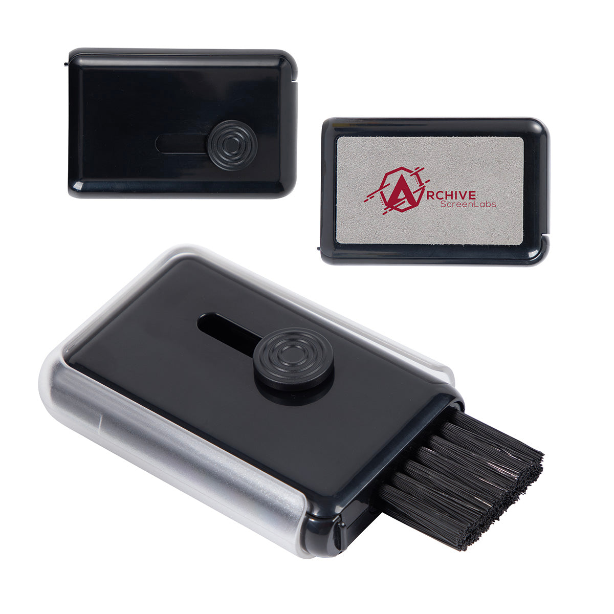 Keep your devices clean with our innovative Whisk cleaning tool! This compact gadget features a flip-open compartment to securely hold a small bottle of spray cleaner, while one side includes a soft cloth screen cleaner protected by a sliding case. Easily access the slide-out button to reveal a handy brush for dusting away keyboards. Constructed from durable ABS plastic, this essential accessory is portable and perfect for ensuring your electronics always look their best.