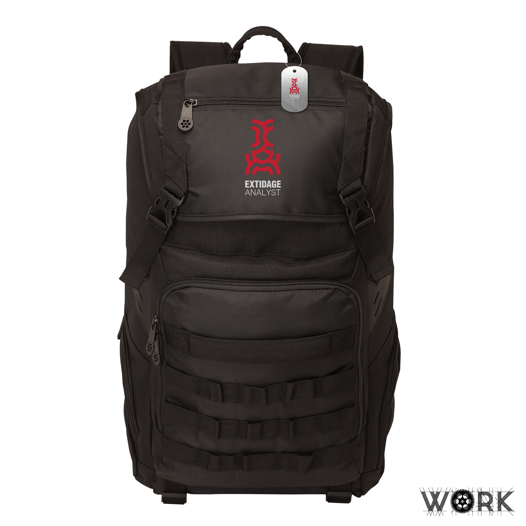 The fully-lined Work® Outdoor backpack is made with durable ripstop polyester and 420D polyester dobby with 210D polyester lining. It has a deep main section with a tablet compartment, 15.6" laptop or hydration pack compartment and features a top cinch closure and buckled hood flap with zippered pocket. The outside offers a zippered front compartment with padded front grab handle, two zippered side pockets, bottom blanket/towel straps and plenty of daisy chain accessory loops along with a quick-access zippered top entry and top elastic cable/hydration hose hole. The backpack has a top carry handle, padded back, adjustable air mesh backpack straps and a chest strap. A portion of all proceeds is donated to Shelter to Soldier™, a non-profit organization that rescues dogs to train as service animals for veterans in need.