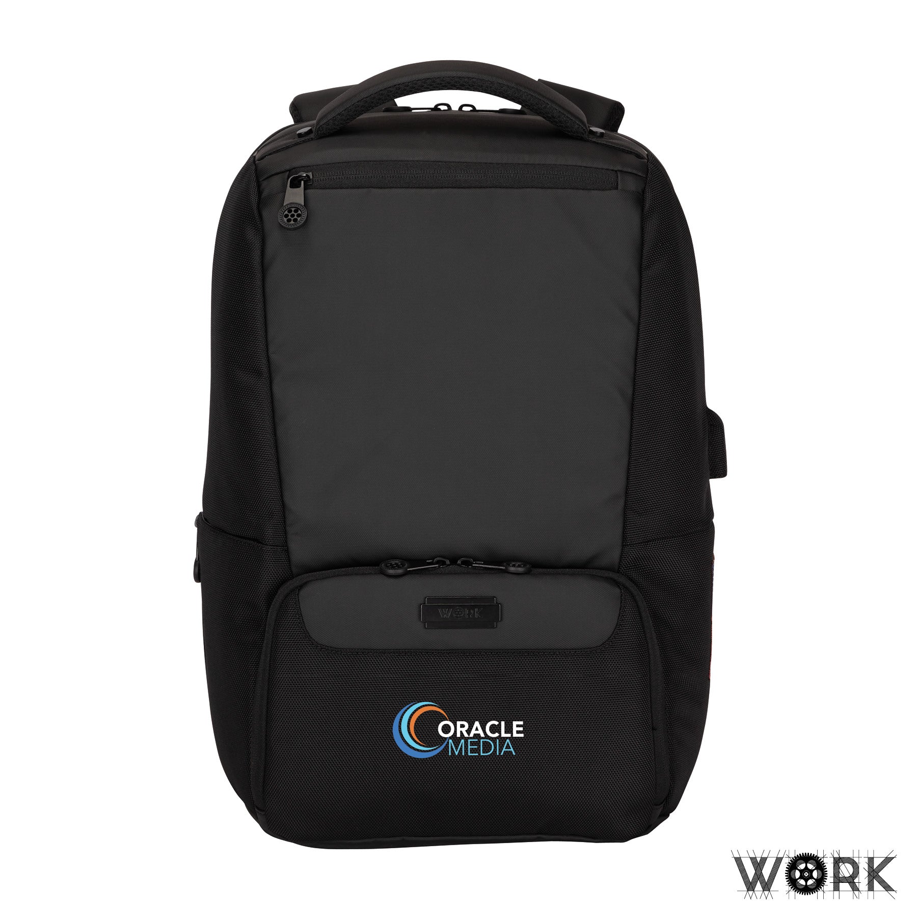 The WORK™ Universe Anti-Gravity Backpack is designed with the business traveler in mind and is made from high quality 1680D and premium coated water resistant materials. This bag is equipped with a unique flexible suspension system that provides load distribution and dynamic load compensation, which improves your posture and reduces strain on your back and neck muscles, reducing the risk of stiffness and soreness after carrying heavy loads. This business backpack also includes an exterior, built-in USB charging port and cable, providing you a more convenient way to charge your phone while on the go. The large main compartment has padded pockets for a laptop and tablet and 2 organizer slip pockets. There are 2 front zippered pockets for your smaller accessories and an exandable side water bottle pocket. The Universe backpack also features a thickly padded carry handle, heavily padded shoulder straps and back, a trolley strap, and a backside zippered security pocket.