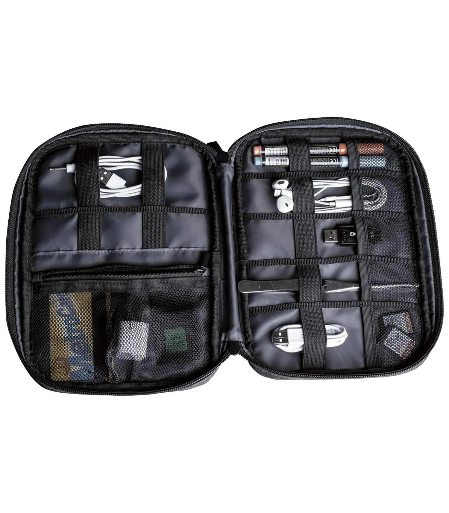Keep all or your valuable tech neat and organized inside of this organizer case. This zippered fabric case has secure flaps and mesh pockets for external drives, cords, cables, SD cards, chargers and other gear. The exterior features a generous front pocket for extra storage.